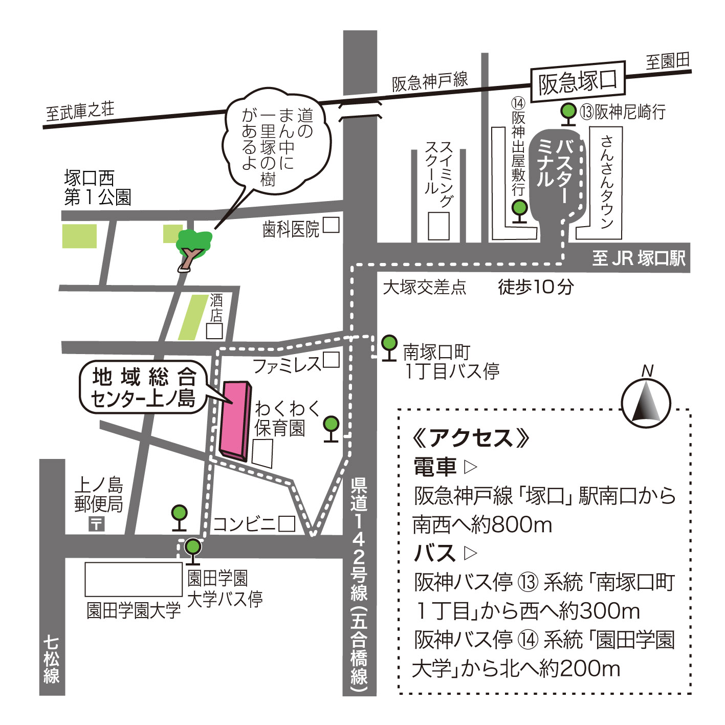 バスの場合 阪神バス14系統「園田学園女子大学」から北へ約200m。 阪神バス13系統「南塚口町1丁目」から西へ約300m。